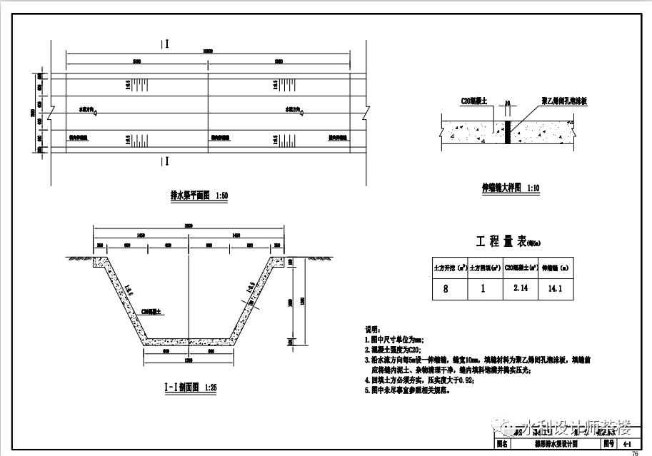第五部分渠系建筑物工程 (2)根据所跨沟渠宽度及路面宽度确定桥梁跨径、面宽及桥长设计等。(3)上部结构设计。包括梁、板、栏杆、缘石设计及配筋计算。桥梁配筋要进行正截面抗弯承载力计算、斜截面抗剪承载力计算,盖梁应进行配筋计算。(4)下部结构设计。桥梁下部结构分重力式墩台和桩基两种。重力式墩台应根据工程区地质情况进行基底应力验算、墩台稳定验算及承载力计算;桩基应根据工程区地质情况进行各桩入土深度计算、桩长计算及桩配筋计算等。(1)管涵轴线宜短而直,并宜与沟溪、道路中心线正交,进、出口应与上、下游渠道平顺连接。(3)管涵的形式可根据水头、建筑材料及施工条件等确定,常用的有钢筋混凝土管涵。(5)管涵的进出口根据实际需要设置扭曲面护坡或八字墙,并与上、下游渠道顺畅连接。(6)管涵过流能力计算。当管涵进、出口采用挡土板形式时,应进行配筋计算。(1)节制闸闸室结构宜采用开敞式,闸底槛楼顶宜与莱底齐平或略高于莱底;闸孔设计过水断面面积宜与莱道过水断面面积相适应。(2)分水闸闸室结构宜采用开敞式或封闭式,闸底楼槛顶宜与上一级渠底齐平或略高于上一级渠底,多泥沙渠道上应略高于上一级渠底;单股分水闸的分水角度宜取600-900,双股分水闸的分水角度宜对称相等,多股分水闸的分水角度可因地制宜确定。(3)水闸结构设计应根据结构受力条件及工程地质条件进行。计算内容包括闸孔尺寸确定、闸室稳定计算、岸墙及翼墙稳定计算、消能防冲计算、内力计算和配筋设计等。第四章倒虹吸 (1)倒虹吸轴线在平面布置上的投影宜为直线,并宜与河流沟渠、道路等中心线正交,进、出口应与上、下游渠道平顺连接。 (2)倒虹吸进、出口应设置渐变段,其长度分别取上、下游渠道设计水深的3-5倍和4-6倍,进口段应设拦污拦沙设施。 (3)倒虹吸可根据地形、地质条件和穿越河流、沟渠、道路的具体情况选择上埋式、沟埋式或架空梁式。 (4)倒虹吸横断面可采用圆形、箱型或拱形等,流量大、水头低时也可采用矩形。 (5)倒虹吸可根据流量、水头、建筑材料和施工条件等,选用混凝土管或钢筋混凝土管等。 (6)倒虹吸设计应进行倒虹吸过水能力计算、总水头损失计算、结构计算等。 第五章其他工程 其他工程含溢流堰和量水槛。