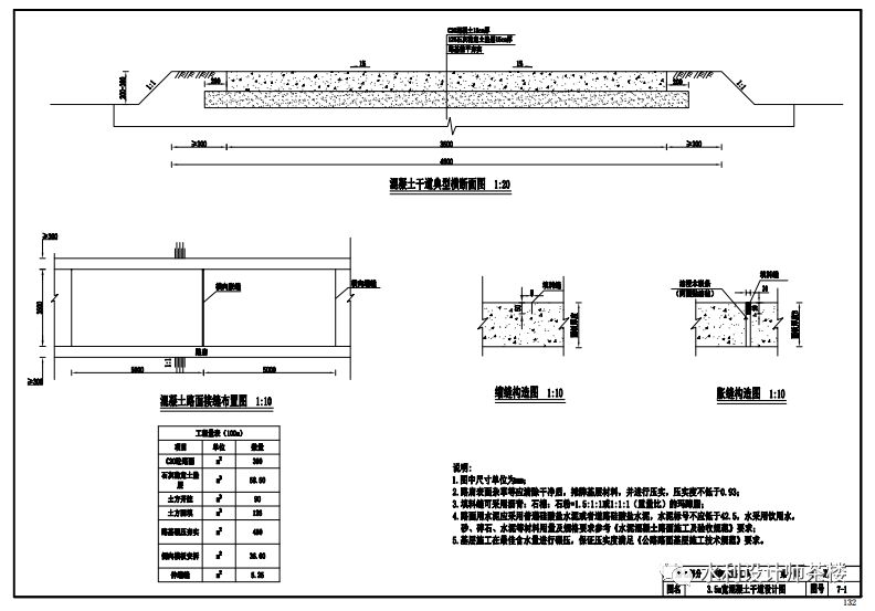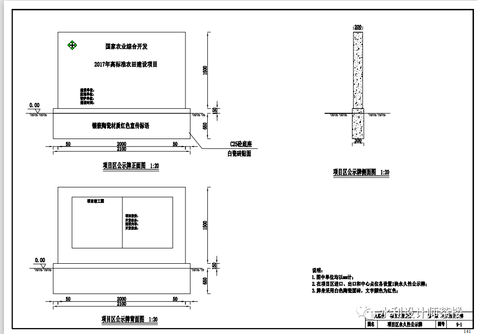 第七部分 田间道路工程 设计说明 第一章干道 干道一般宽左右,稻作区、丘陵山区不低于3m。混凝土或沥青路面,并增设路肩,路肩宽度不低于0.3m。第二章支路 支路为方便田间生产及耕作要求而修筑,素土或泥结碎石路面,宜为单车道,路面宽不超过3m。 第八部分林网工程 (1)项目区要因地制宜地采取林业措施,平原地区加强农田防护林网建设;丘陵山区要积极营造水土保持林、水源涵养林。(2)主要道路、沟渠两侧,适地、适树营造农田防护林网。干道宜植2行树,支路可植1行树。在有显著主害风的地区,采取长方形网格配置,尽可能与生态林、环树林等相结合。 项目区永久性公示牌是落实项目资金公示制的一项措施,在项目区进口、出口和中心点位宜各设置一块永久性公示牌。项目区开发面积为2万亩以上的,公示牌数量可根据需要增加。主要单项建设工程均要镶嵌、粘贴或喷涂工程标志牌(徽)。标志牌(微)要清楚、醒目。