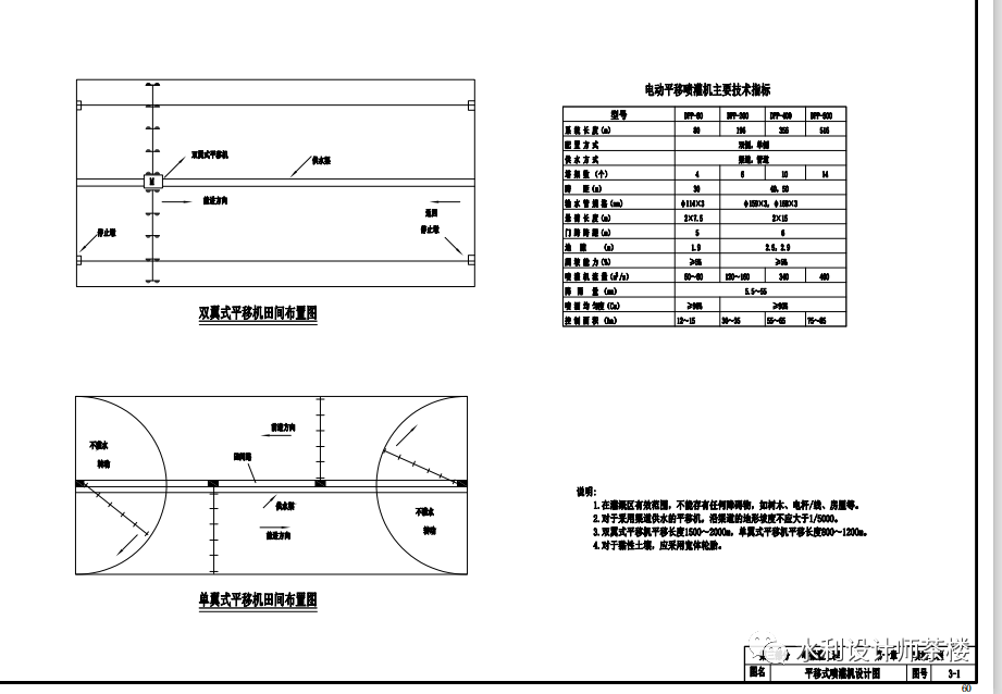 设计说明 第一章喷灌 (1)系统布置。结合整体布局进行喷灌系统规划设计,根据种植作物、灌溉水源情况划分系统。(2)管网布置。包括干管布置和支管与喷头的布置(对于丘陵梯田,因作物基本沿等高线种植,支管布置采用平行等高线布置,每层梯田布置一根支管,沿支管布置喷头时,需考虑其喷洒半径以下不湿润田埂为宜,以免冲刷田埂造成水土流失)。(3)进行设计灌水定额计算、设计喷灌周期计算、喷头流量计算,按照计算的喷头流量进行喷头选择。(4)喷灌系统工作制度确定。根据作物需水要求及设计灌水定额,计算一次喷灌所需时间和各种喷灌系统同时工作的喷头及支管数量。(5)进行喷灌系统水力计算。包括流量推算、管径选择计算、水击压力计算、水头计算、管网水头损失计算等。(7)喷灌系统首部枢纽设计。在系统管网的首部设有水泵、闸阀、进排气阀、缓闭止回阀、压力表等设施。(8)附属设施设计。包括管沟设计、阀门井设计、镇墩设计,以及配套的电力工程设计等。(1)系统布置。结合整体布局进行微灌系统规划设计,根据种植作物、灌溉水源情况划分系统,画出管网平面布置及管网结点图。(2)管网布置。根据灌水器的参数、轮灌方式和作物种植方式布置输配水管网。(3)末端灌水器选用。末端灌水器的作用是向作物根系附近土壤供水,满足作物对水分的需求,应根据不同种植作物选用合适的滴头流量及滴头间距。(4)微灌系统工作制度确定。应根据项目区情况,并考虑系统的工作制度、设备维修等因素。按照拟定的灌溉制度计算作物一次灌水延续时间和轮灌组数。(6)进行微灌系统水力计算。包括流量推算、管网水头损失计算、微灌系统设计水头计算、系统水头损失计算等。(7)系统首部枢纽设计。首部是整个微灌系统的控制中枢,它由水源、水泵、进水闸阀、排水闸阀、进排气阀、缓闭止回阀、压力表、施肥罐及其他管件等组成。过滤系统由过滤器、筛网过滤器及其他管件等组成。(8)附属设施设计。包括泵房及进水池设计、管沟设计、阀门井设计、镇墩设计及配套的电力工程设计等。