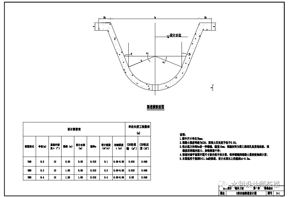 第二部分输水工程 设计说明 第一章渠道输水 (1)根据项目区周边材料供应情况确定硬化方式。 (2)根据项目区具体情况,确定明渠输水渠道的断面形式。 (3)选用合理的水力参数。渠底比降应根据渠道沿线地形,地质条件,设计流量和含沙量等因素,通过计算分析确定,在满足渠道不冲不淤的条件下以较缓为宜;根据硬化方式确定明渠输水渠道的糙率。 (4)根据项目区用水要求选用合适的断面尺寸,并进行过水能力计算。渠道的纵横断面设计要保证设计输水能力、边坡稳定和水流安全通畅;各级渠道之间和渠道各分段之间及重要建筑物上下游水面平顺连接;末级渠道放水口的水位高出平整后田面进水口不少于10cm,且要保证施工运用和管理方便。 第二章管道输水 (1)根据项目区具体情况确定输水管道的材质及具体形式。 (2)根据项目区田块用水要求进行管径选型计算。 (3)根据输水管道长度及首末端高程差进行管道压力计算和沿程水头损失计算。 第三部分喷微灌工程