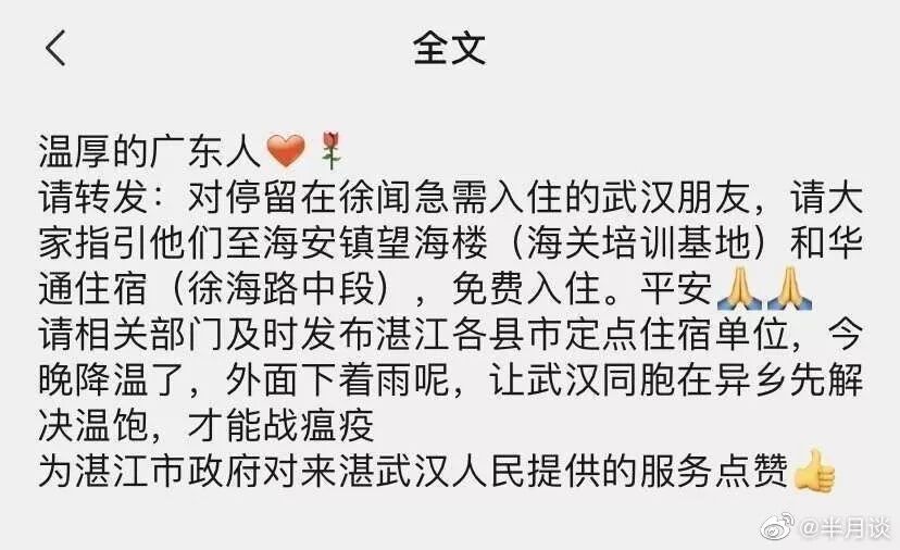 抗击疫情是与不断发展的疫情的一场赛跑,我们必须赢。此时此刻,我们尤其需要齐心协力、众志成城。我们欣慰地看到,在广东一些地方,当急需入住的武汉朋友到来,地方政府在履行重大突发公共事件响应举措时,不是简单地封堵、恶意地驱赶,而是安排好免费入住的场所,及时善意地予以指引。“请相关部门及时发布湛江各县市定点住宿单位,今晚降温了,外面下着雨呢,让武汉同胞在异乡先解决温饱,才能战瘟疫。”无情的疫情面前,这样的做法温暖人心,展现了公共治理的温度:既做到了有效管控,又能够温暖人心,值得借鉴学习。